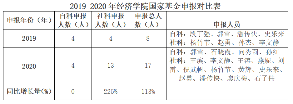 截止2020年4月28日,经济学院2020年度国家科学基金申请集中报送工作圆满结束,共申报国家自然科学基金项目、国家社科基金项目合计17项。具体申报情况如下: