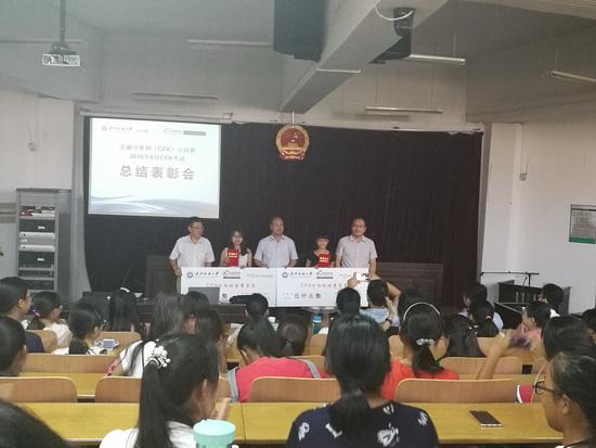 随后,经济学院分党委毛长文书记宣布表彰决定,授予以10门课程全优成绩通过考试的史娟、徐颖两位同学“CFA方向班优秀学员”称号,并各奖励人民币五千元;对于通过考试的吕宙等九位同学给予通报表扬,并各奖励人民币五百元。教务处同小军处长、高顿财经华中区区域总监刘锐先生上台为学生颁发奖状和奖金并合影留念。