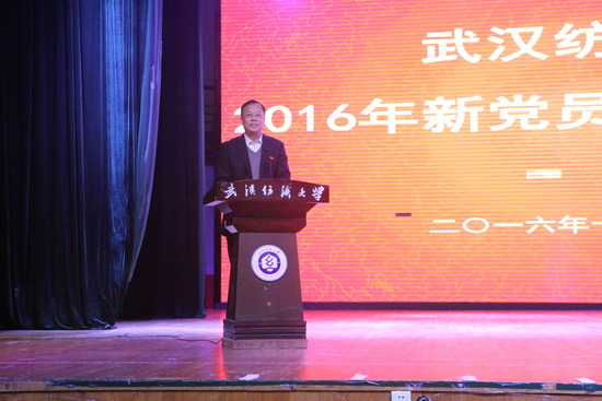 校党委副书记刘在洲教授代表学校党委向各位党员同志们表示热烈的欢迎和衷心的祝贺。他表示,2016年是我们党和国家极不平凡且具有重大意义的一年,既是建党95周年,也是红军长征胜利80周年;党的十八届六中全会胜利召开,确立了习近平总书记的核心地位,开启全面从严治党的新时代,进入全面深化改革的快车道。对于在座同学来说也是永生难忘的一年,因为拥有了党员身份。刘书记对全体新党员还提出了四点希望:一是坚定理想信念,精神上不能“缺钙”。学习贯彻“三实三严”、“两学一做”学习教育,努力加强党性修养,始终做到政治信仰不变、政治立场不移、政治方向不偏;二是加强理论学习,思想上不能“贫血”。希望党员同志们重视学习、主动学习、善于思考,做思想成熟、作风过硬的党员;三是发挥先锋作用,行动上不能“乏力”。党员同志们要学在先、行在前,在各方面争当先进,勇做排头兵,还要通过身体力行引导和带动身边的同学共同进步;四是树立良好形象,行为上不能“抹黑”。希望同志们既要有党员之“魂”也要有党员之“形”。
