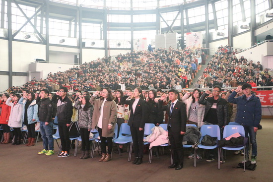 天时人事日相催,冬至阳生春又来。12月21日下午,武汉纺织大学在大学生活动中心演播厅庄严举行2016年新党员集体宣誓大会。校党委副书记刘在洲教授、党委常委张文凯教授、学生工作部部长金艳教授、经济学院党委书记毛长文教授、党委组织部副部长涂耀威、经济学院党委副书记邹茜,二级学院学生党支部书记及近千名新党员参加了宣誓大会。