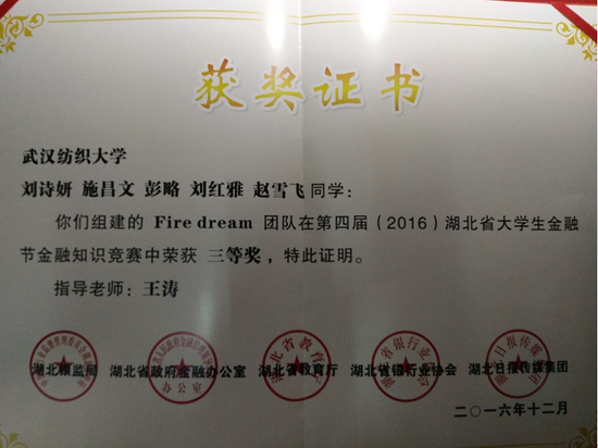 近日,由湖北省银监局、省政府金融办、省教育厅、省银行业协会和湖北日报传媒集团共同主办的第四届(2016)湖北省大学生金融节暨银行业金融知识宣传服务月活动圆满落幕。全省20余家银行机构代表、数十所高校师生代表出席闭幕式。在当天举办的金融知识竞赛总决赛中,我校经济学院王涛老师指导的Fire dream代表队获团体三等奖。