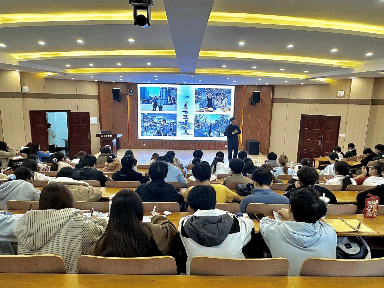 围绕“青年成长与时代使命”这一主题,刘园美以“理论指引+实践示范”为框架,从四个维度进行系统阐释。在“与时代同频:青春的使命担当”篇章中,他讲述学院16级毕业生黄何林的故事:面对一线城市的优厚offer,黄何林毅然选择投身西部计划,在边疆地区克服气候不适、饮食差异、生活孤独等多重挑战,用实际行动践行“胡杨精神”中艰苦奋斗、扎根边疆、甘于奉献的核心要义。他引用习近平总书记给西部计划志愿者的回信精神,着重强调:“青年一代要把个人理想融入党和国家事业之中,在祖国最需要的地方绽放青春光彩”。