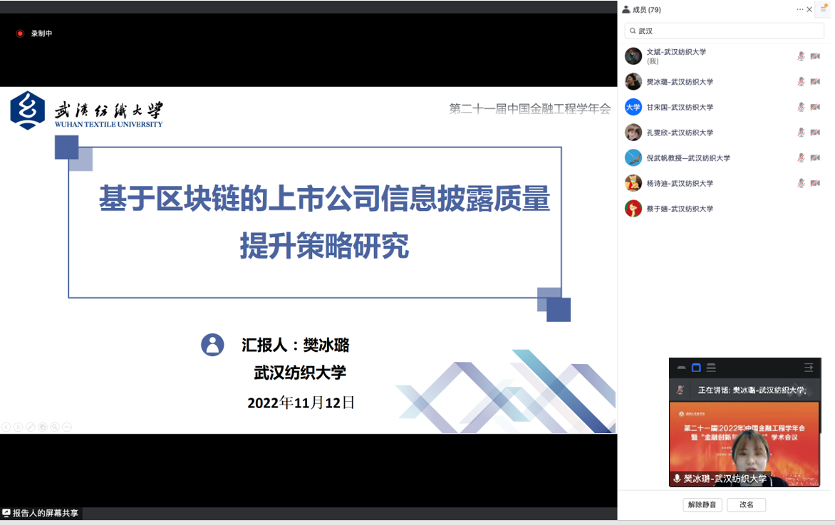 倪武帆教授与研究生文斌、樊冰璐等共同完成的学术论文《基于区块链的上市公司信息披露质量提升策略研究》成功入选,并受邀参加本届年会,樊冰璐代表项目团队在学术论坛上作了主题报告和发言。11月12日下午,樊冰璐在主题为“资本市场与风险投资”的分会场进行了项目研究的成果展示,并就相关研究的背景、方法、技术路线、实证结论等内容作了专题报告。该研究成果以提升企业信息披露质量为目的,揭示了影响信息披露质量的因素,剖析了重要信息虚假披露、负面信息隐瞒披露、无效信息过度披露等诸多信息披露质量问题,提出了运用去中心化技术、分布式账本、智能合约技术、溯源时间戳等对策。樊冰璐的报告精炼、流畅,得到了与会专家的一致好评。同时,樊冰璐还作为点评嘉宾,点评了《金融工程“优质数字金融科技人才”跨专业培养模式的研究》专题报告,在点评分析环节中,结合我校实践,樊冰璐分享了我校经济学院在本科层次有关金融科技方向、CFA方向、金融学双学位的办学经验,在研究生培养过程中充分运用中信证券研究生工作站、长江成长资本股份有限公司研究生工作站、金融数学研究院(筹)等学术平台、实践实训平台提升培养质量的创新做法,得到与会专家学者充分肯定和积极评价。