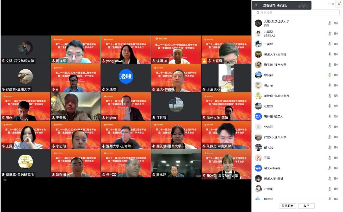 2022年11月11日-13日,第二十一届中国金融工程学年会暨“金融创新与共同富裕”学术会议在温州大学成功举办。本届学术年会由中国金融工程学年会和温州大学联合主办,温州大学商学院承办,浙江省人文社科重点研究基地温州人经济研究中心、温州市金融研究院、温州市社会科学重点研究基地长三角一体化研究中心等学术机构、《中国证券期货》杂志社等单位协办。