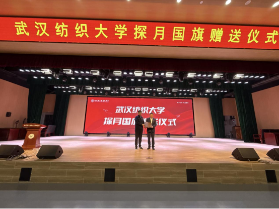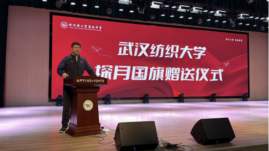 作为武汉纺织大学校友,黄公望高级中学教师陈亚卓动情分享国旗背后的故事,“这面织物国旗凝聚八年攻关的坚韧与院士团队的智慧,既是纺织科技的突破,更是中国航天精神的具象化表达”,话语间传递的科研精神与家国情怀,让在场学子深受触动。仪式高潮环节,刘园美代表武汉纺织大学,郑重将月面国旗同款珍品交至黄公望高级中学校长林日青手中,象征两校合作正式启航。