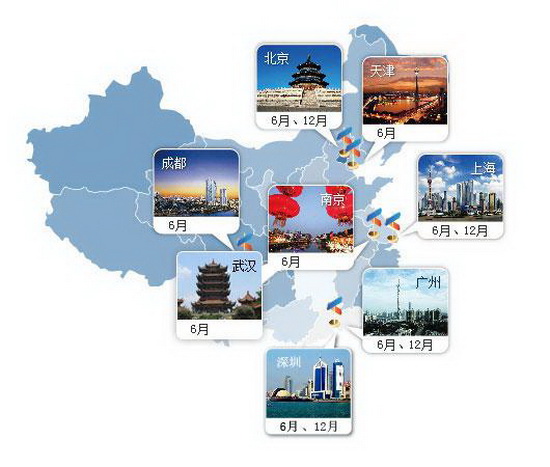 6月国内大陆地区CFA考点:北京、上海、广州、南京、成都、天津、深圳、武汉(2015年6月新增)。
