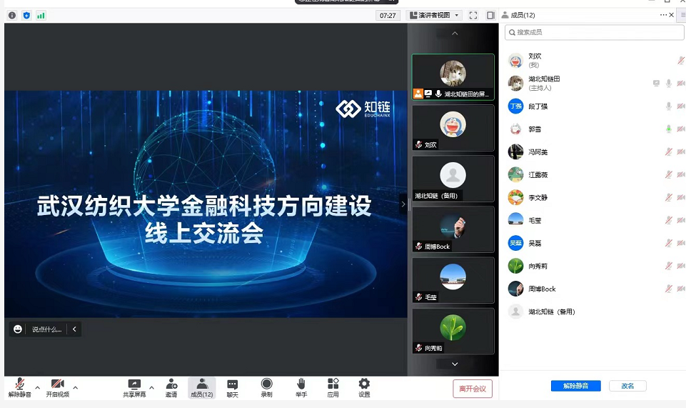 为加强学科专业建设,7月14日上午,经济学院通过腾讯会议线上平台召开了金融学专业(金融科技方向)建设研讨会,学院院长段丁强、金融系主任毛莹及金融科技相关课程教师参加会议,北京知链科技有限责任公司的校企合作部总经理史磊、方案总监周博和湖北知链有限公司副总经理田展飞等校外专家受邀参会作交流指导,会议由金融科技专业方向负责人郭雪主持。