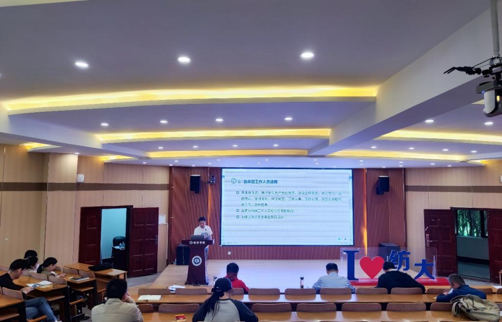 学院副院长王滨在会上宣讲了关于开展武汉纺织大学硕士研究生入学考试自命题培训工作的通知。他首先指出,根据《武汉纺织大学硕士研究生入学考试自命题管理办法》自命题培训工作主要内容包括三个方面:自命题工作人员选聘、试题定制和评卷。