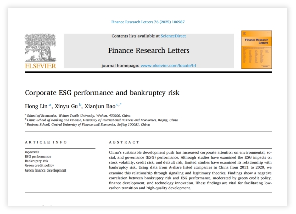 近日,经济学院研究生林洪在导师史乐来老师的指导下,与中央财经大学和对外经济贸易大学的博士研究生合作在国际期刊Finance Research Letters(《金融研究快报》)上发表了题为“Corporate ESG performance and bankruptcy risk”(企业ESG绩效与破产风险)的学术论文。