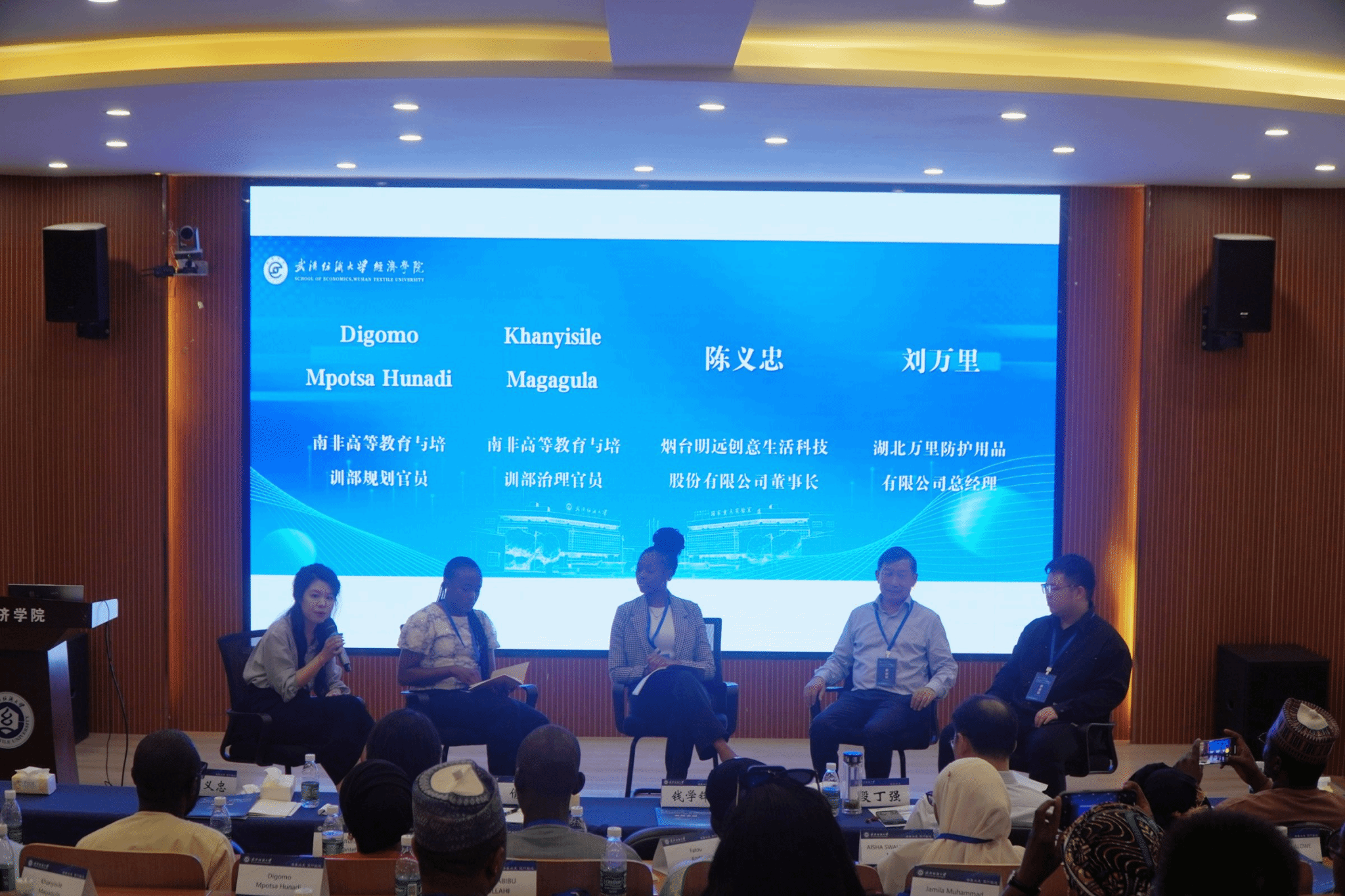 主旨报告结束之后,由经济学院董珉怡博士主持并参与了题为《美国新关税政策下政府与企业的应对》的圆桌论坛,南非高等教育与培训部规划官员Digomo Mpotsa Hunadi 、南非高等教育与培训部治理官员Khanyisile Magagula、烟台明远创意生活科技股份有限公司董事长陈义忠和湖北万里防护用品有限公司总经理刘万里作为圆桌论坛嘉宾,与在场的南非高等教育与培训部学员代表、经济学院留学生和研究生进行了热烈的讨论。