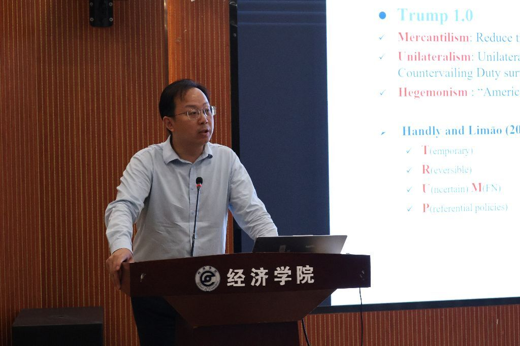 经济学院石小霞副教授以“中美贸易战后我们何去何从”为主题,系统分析了当前中美关税政策及其影响。她指出,一方面,中国政府加速实施2万亿刺激方案,旨在提振消费增速,缓解经济下行压力;另一方面,中国积极推动经济转型,从传统的出口导向型经济逐步向以国内需求为主导的消费驱动型经济转变,稳步推进“中国2030市场”计划。此外,她就人民币汇率波动对出口竞争力的影响展开探讨,表明人民币适度贬值虽能在一定程度上减轻关税带来的成本压力,但其效果有限且存在引发贸易报复的潜在风险。
