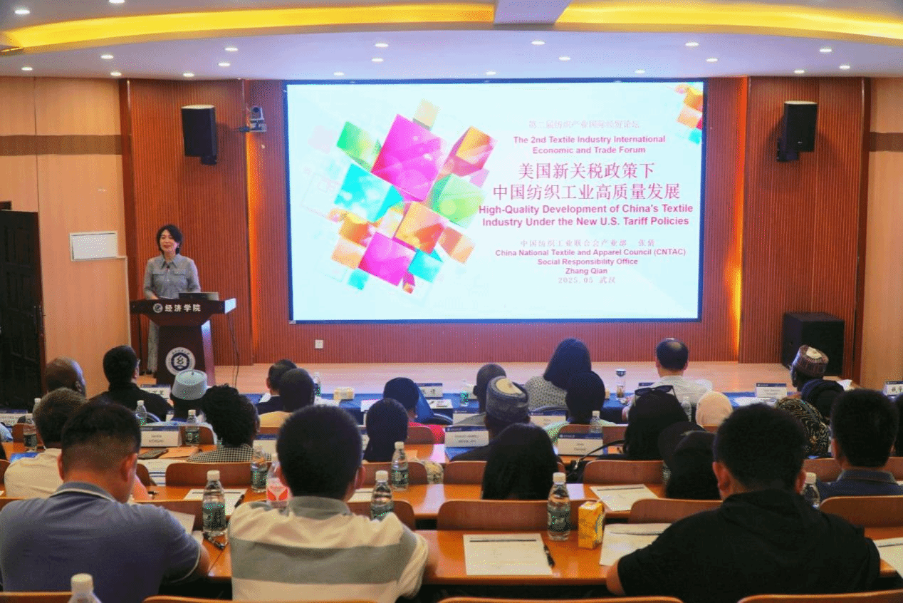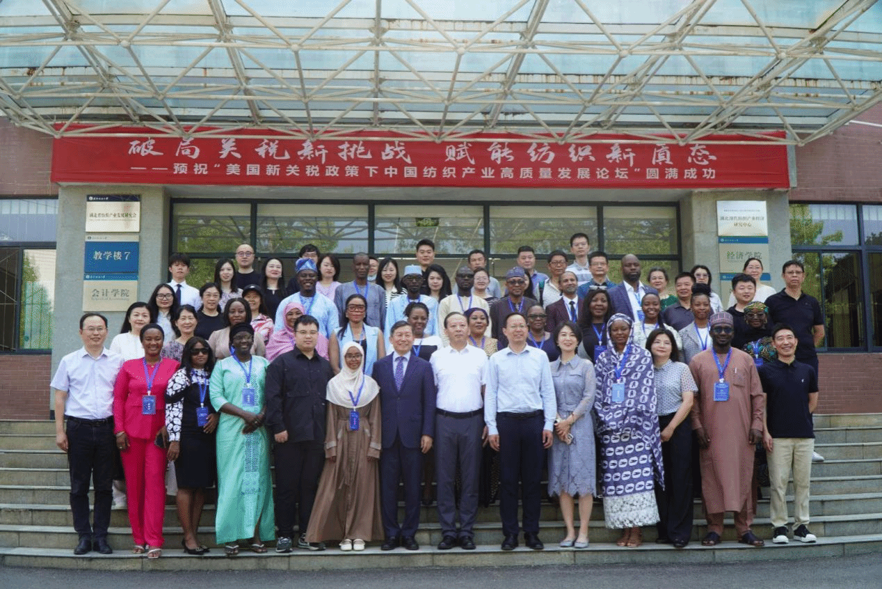 5月21日,“破局关税新挑战 赋能纺织新质态”美国新关税政策下中国纺织产业高质量发展论坛在武汉纺织大学顺利举行。本次会议由湖北现代纺织产业经济研究中心主办,武汉纺织大学经济学院、国际处承办,旨在共同探讨美国新关税政策下中国纺织产业的应对策略与发展路径,为纺织产业高质量发展提供支持。武汉纺织大学党委常委、副校长冯军,中南财经政法大学教务部部长钱学锋,中国纺织工业联合会产业部处长张倩,尼日利亚国防部特别顾问Tijjani Abdullahi Dankumbo,南非高等教育与培训部官员Digomo Mpotsa Hunadi、Khanyisile Magagula,烟台明远创意生活科技股份有限公司董事长陈义忠,湖北万里防护用品有限公司总经理刘万里、南非高等教育与培训部学员代表、学院师生代表参加论坛。论坛开幕式由经济学院院长段丁强教授主持。
