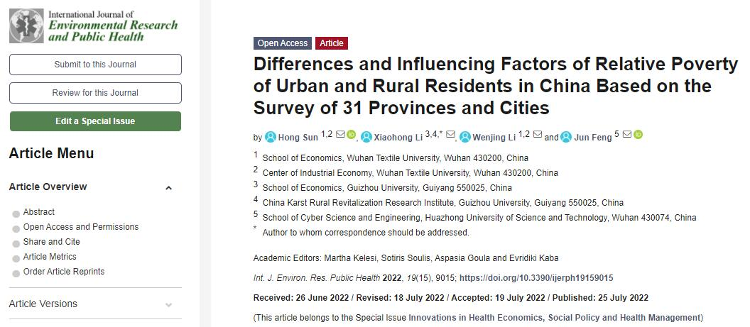 近日,我院金融系孙红老师在国际知名期刊《International Journal of Environmental Research and Public Health》(SSCI/SCI 双检索,JCR一区,IF: 4.614),发表《Differences and Influencing Factors of Relative Poverty of Urban and Rural Residents in China Based on the Survey of 31 Provinces and Cities》一文,文章DOI:https://doi.org/10.3390/ijerph19159015。武汉纺织大学为该论文的第一作者单位,孙红为该论文的第一作者。