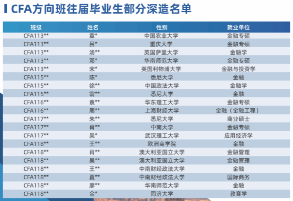 区别于CFA业余制培训班,金融学(CFA方向)是我校官方开设的一个特色专业方向,隶属于经济学院金融学专业,学制四年。学生在获得我校金融学专业本科毕业证书和经济学学士学位的同时,还可收获国际前沿的财经知识与技能,参加被誉为“金融投资行业高等级证书”的CFA执业资格考试,更具就业竞争力。