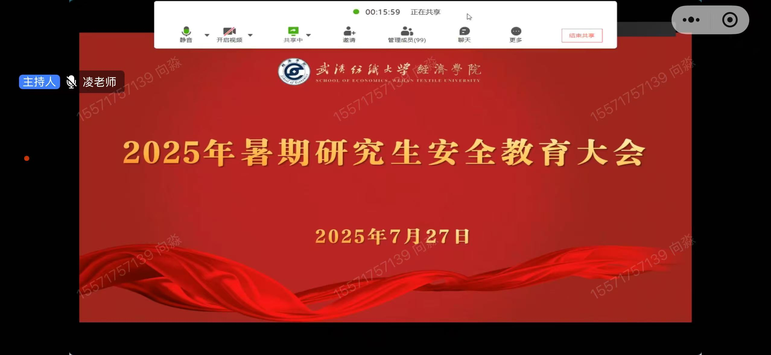 为进一步强化学生暑期安全防范意识,有效预防安全事故发生,保障同学们度过一个平安、健康、快乐的暑期,7月25日-27日,经济学院通过线上平台召开暑假安全主题教育班会。会议由年级辅导员、班主任主持,学院全体学生共同参与。