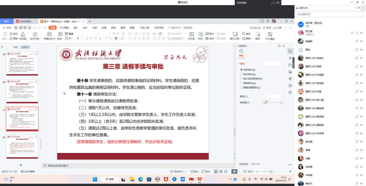 此外,全体班主任和辅导员引导同学们在4月23日世界读书日即将到来之际,感受阅读的力量,获取知识、启智增慧、培养道德,得到思想启发,树立崇高理想,涵养浩然之气。为学校的学风建设和安全建设做出自己应有贡献,并带领同学们学习诈骗手段及预防措施,组织同学们观看防范网络电信诈骗视频。除此之外,组织同学们观看就业宣传视频,帮助学生解答考研、择业、就业和创业疑惑,并带领同学们学习五一”小长假安全小贴士,重温武汉纺织大学本科生考勤及请假管理办法。