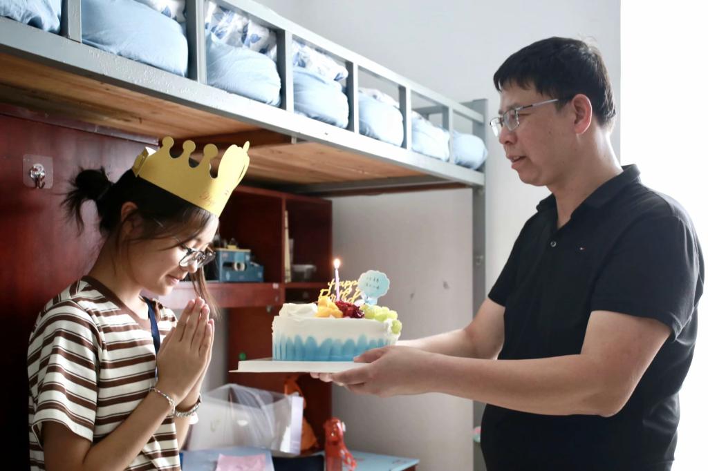 得知2023级有学子恰逢开学季生日,学院特意精心准备了新生“庆生”活动。学院党委书记刘园美、党委副书记李静宇、新生辅导员一行人走访女生寝室11B518,与金融12303夏静怡同学及其家人共同见证难忘时刻。学院准备了蛋糕,刘园美为新生戴上生日帽,大家齐唱生日歌,现场氛围轻松愉快。看到新生青春洋溢的面庞,刘园美为其送去真挚祝福,祝愿她在新环境开启人生新篇章,能快速融入集体,“学有所得”、“学有所用”,人生的考验方才开始。最后,夏静怡表示:“这是一个很难忘的生日,很荣幸能在我十八岁生日这天收到老师们的祝福。对于刘书记寄予我的祝福与嘱托,我铭记于心,在大学期间努力学习,不负老师期待。”