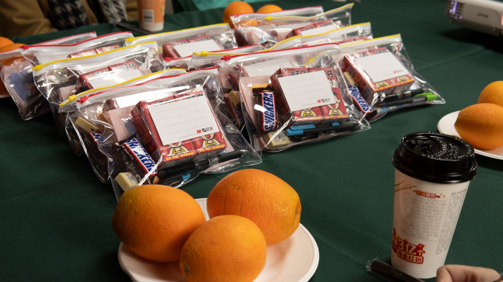 2023级学生代表刘欣荣带来家乡特产——脐橙,代表2023级全体学生为学长学姐送出考研祝福,寓意心想事“橙”,祝愿考研学子考试顺利,马到“橙”功。