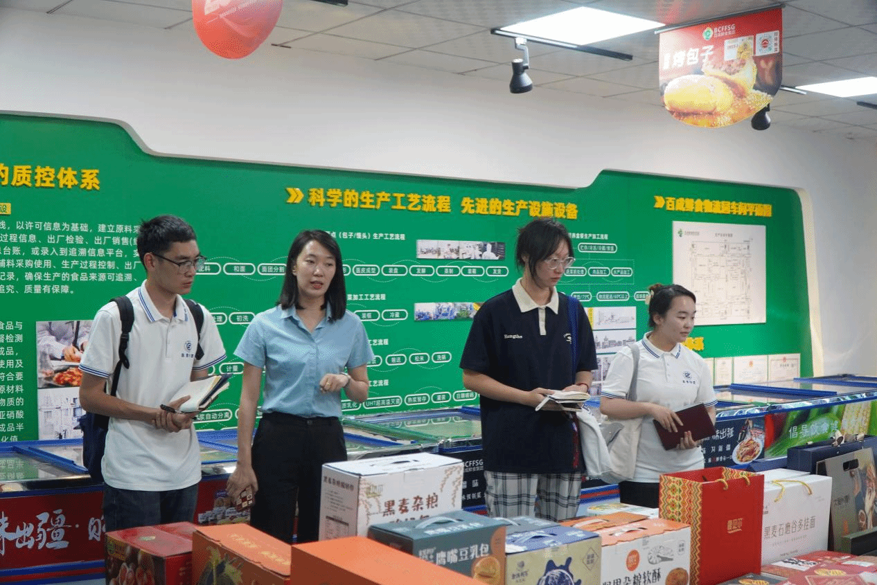 百成鲜食供应链有限公司则是通过集约化管理和工业标准化,打造“双厨房”模式。园区内涵盖有鲜食工厂、仓储物流、供应链体系等多业态形式。通过一站式集采平台,实现链农链商、集采集配的“反向订单式”生产。“‘滚食网’是百成鲜食集团重点打造的餐饮食材一站式集采服务平台,依托集团强大的中央工厂、物流配送优势,为疆内企事业单位、学校、部队、餐饮酒店、社区商超等提供优质的服务。”负责人张美玲向实践队介绍道。面对物流难题,企业通过在全国打造仓储物流配送基地,利用云计算和大数据优化仓储资源,结合线上数字化及智能化管理方式,实现仓储配送无缝衔接。