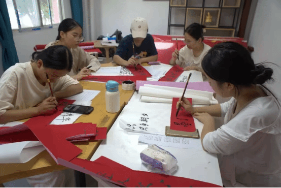 由新生创作,学院老生们一笔一墨撰写的楹联,饱含情感,于红纸间显现着笔墨丹青的独特魅力,浸润的是优秀传统文化,续写的是友谊深厚。24级新生王津津说:“来报到时,远远就在寝室门口看到我们创作的这对联,我们感到很温馨。”在学长学姐们细心地指导与协助下,这些楹联被端端正正地贴在了宿舍门前,仿佛是一道道文化的风景线,点缀着宿舍。“车列山前必有路,景明不负韶华归”,其中一副楹联如此写道,借用了古诗之意,寓意着她们对生活积极向上、乐观进取的态度和对美好未来的期许。