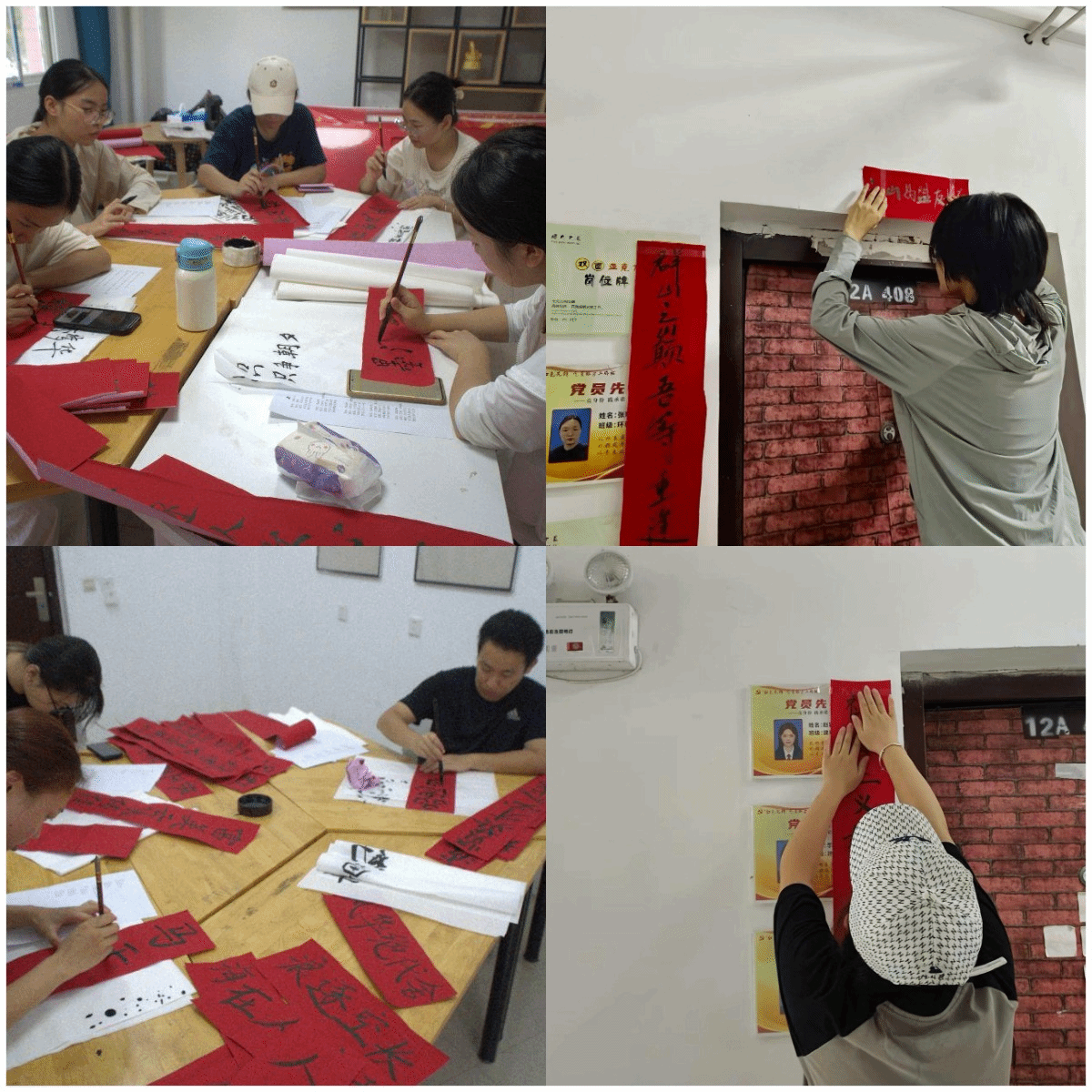迎新之时,在武汉纺织大学12栋学生宿舍楼内,洋溢着浓厚的传统文化气息和喜庆氛围。原来,为迎接新生到来,学生宿舍门口被挂起了一幅幅精心设计的红色楹联,楹联内容不仅融入了新生的名字,更增添了古文描写的韵味,展现了新生们独特的关怀和美好祝愿。由新生创作,学院老生们一笔一墨撰写的楹联,饱含情感,于红纸间显现着笔墨丹青的独特魅力,浸润的是优秀传统文化,续写的是友谊深厚。部分宿舍带来了新生们自己挥墨的楹联,点横撇捺中尽显他们自己的文化内涵。