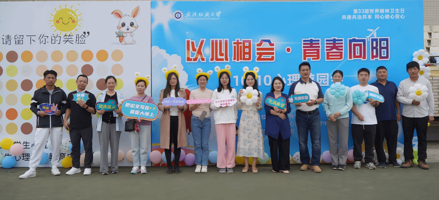 金秋十月,凉风送爽,为广泛宣传精神卫生知识,提升我校学生心理健康知识水平和素养,树立关爱自我、健康成长的心理健康意识,10月10日,2024年武汉纺织大学“世界精神卫生日”宣传教育活动暨“以心相会,青春向阳”嘉年华活动在阳光校区田径场成功举办。活动由校党委学工部、心理健康中心主办,经济学院承办。我校党委学工部副部长朱美龙、心理健康中心全体教师、各二级学院心理辅导员及学生代表参加此次活动。