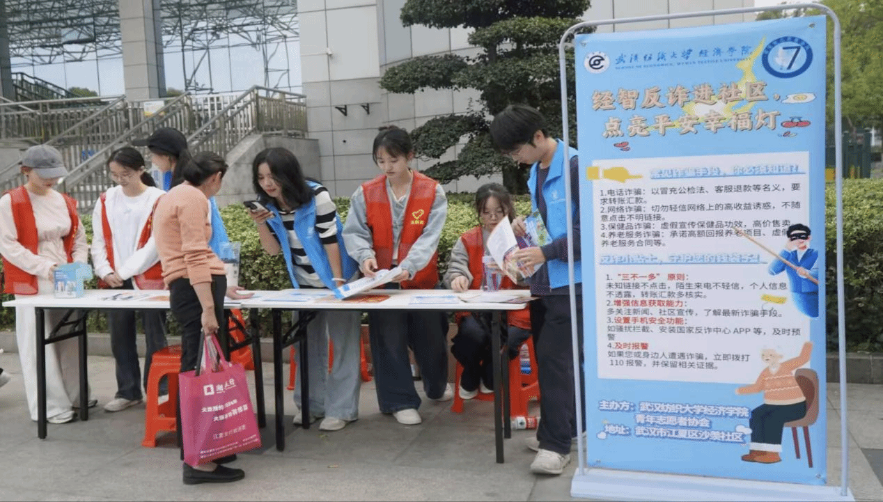 反诈宣传进社区,志愿服务暖人心。为了提高社区居民的防诈骗意识,保障居民财产安全,11月14日下午,武汉纺织大学经济学院零零欺志愿服务队走进江夏区纸坊街道沙羡社区,开展了一场以“经智反诈进社区,点亮平安幸福灯”为主题的反诈宣传活动,为社区居民带来了一堂生动实用的反诈知识课。