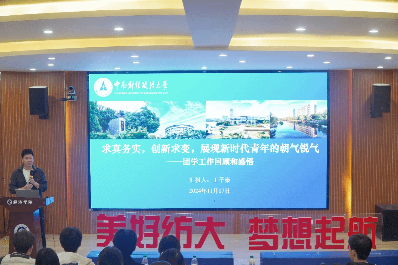 为深入贯彻落实党的二十届三中全会精神,进一步提升学院学生干部队伍的综合素质,增强团队协作能力,11月17日,学院于崇德楼T301演播厅成功开展“青马工程”第二讲暨学生骨干培训会。本次会议邀请中南财经政法大学马克思主义学院博士研究生王子秦主讲,经济学院全体学生干部、“青马工程”学员参加。
