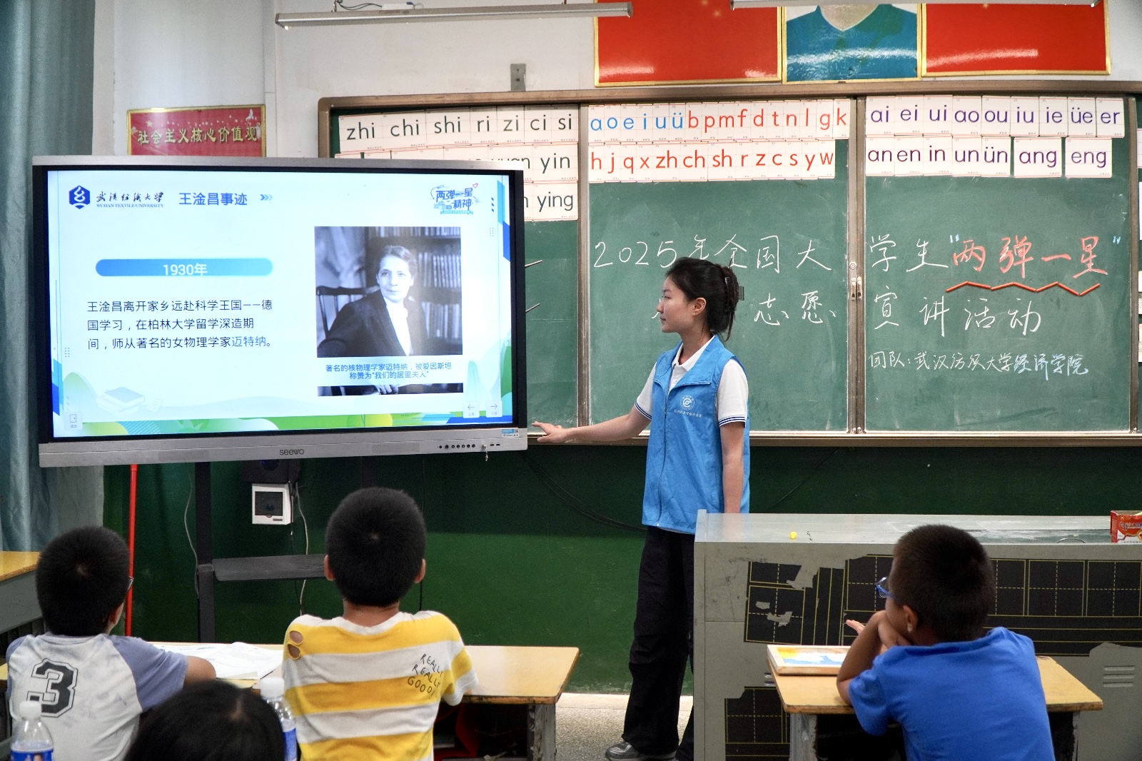 当日上午,队员们以生动的案例向孩子们科普航天科技知识,特别介绍了武汉纺织大学的科研成果——由玄武岩纤维“织”成的五星红旗,并通过实物图片和原理演示,让孩子们感受到“纺织+航天”的跨界创新魅力。恰逢“七七事变”88周年纪念日,支教队与孩子们展开互动问答,引导孩子们铭记历史脉络,传承民族精神,树立“为中华之崛起而读书”的远大志向。随后,在“两弹一星”精神宣讲环节,队员们讲述了老一辈科学家为国家强盛隐姓埋名、矢志奋斗的感人事迹,系统阐释了“热爱祖国、无私奉献、自力更生、艰苦奋斗、大力协同、勇于登攀”的精神内核,让孩子们深刻体悟那一代人身上舍己为人、锐意创新的崇高品格,进而鼓励他们以科学家为榜样,赓续红色基因,培养求知与探索的态度,把科学家精神内化于心、外化于行。