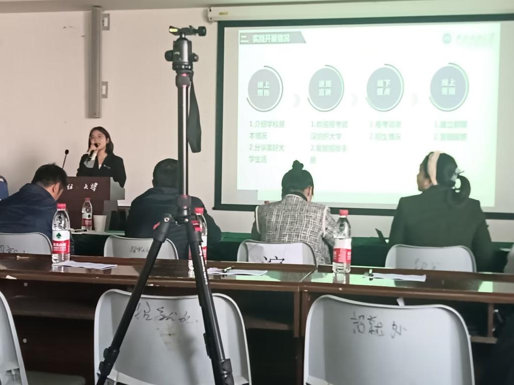 答辩人柳轩从前期准备、活动过程、活动成效等方面展开,分别介绍了团队社会实践开展情况和本队创新点。她表示,团队在实践宣讲过程中,针对高中学生关注的学校资质、招生政策、专业情况、校园环境等问题进行详细耐心地解答,主动讲出“纺大故事”,传递“纺大声音”,积极宣扬纺大“崇真尚美”的校训精神。