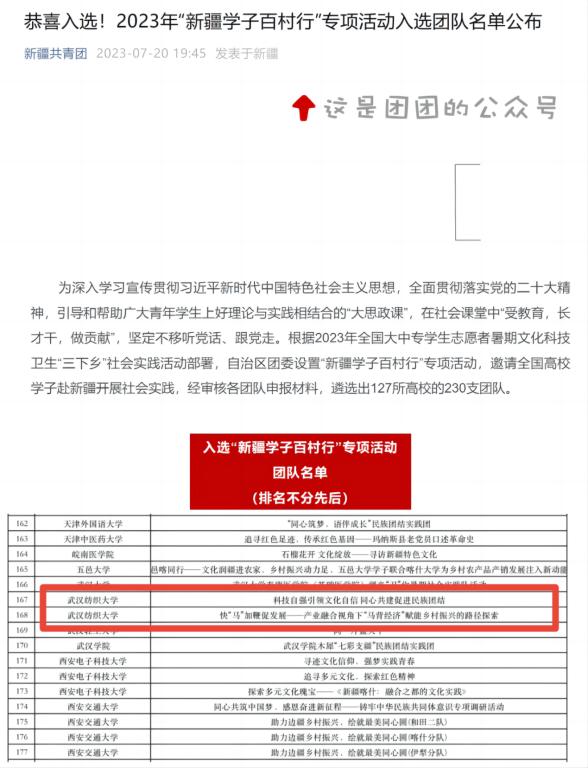 据了解,本次调研是武汉纺织大学经济学院组织开展大学生赋能乡村振兴“十百千”工程的重要实践之一,旨在鼓励青年大学生走出学校小课堂,走进社会大舞台,培养创新精神和学术能力,在实践研学中达到思政教育目的。目前,团队已获批2023年“新疆学子百村行”专项活动立项。