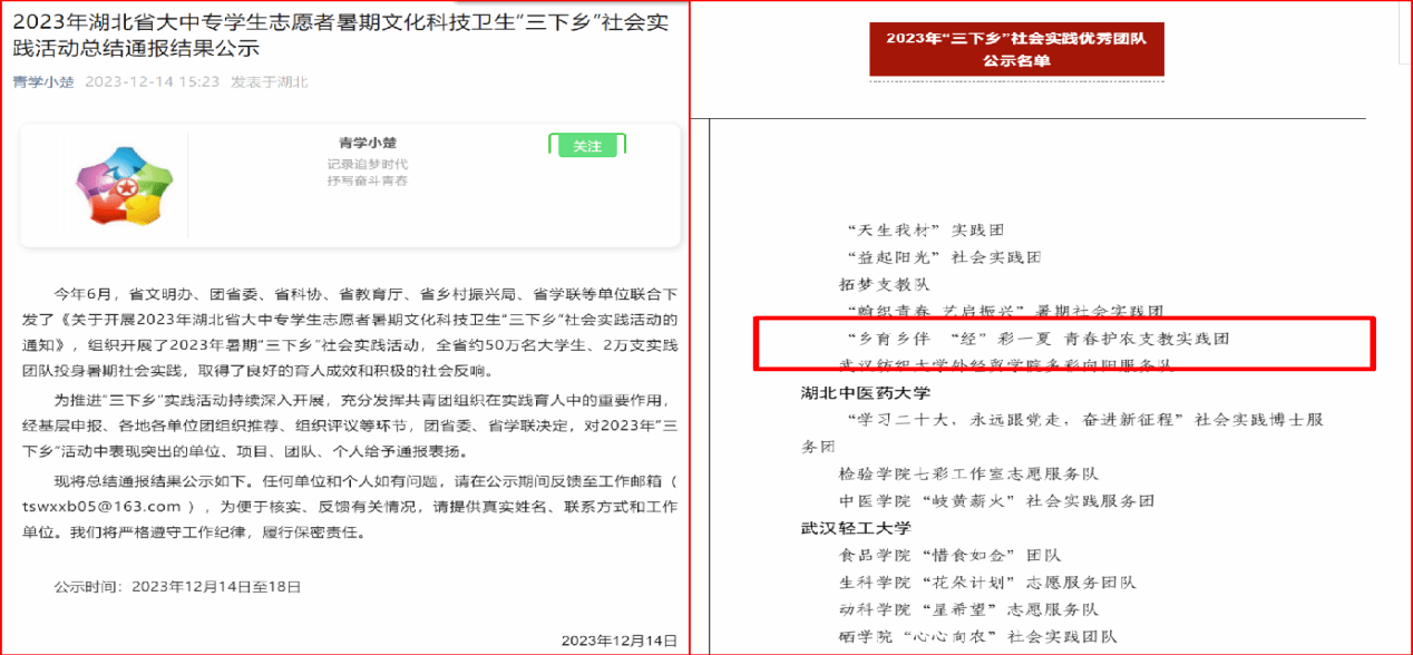近日,经济学院“青春护农”实践团队分别获批教育部中国大学生在线“大我青春”2023年暑期社会实践优秀工作案例、湖北省2023年“三下乡”社会实践优秀团队两项荣誉。