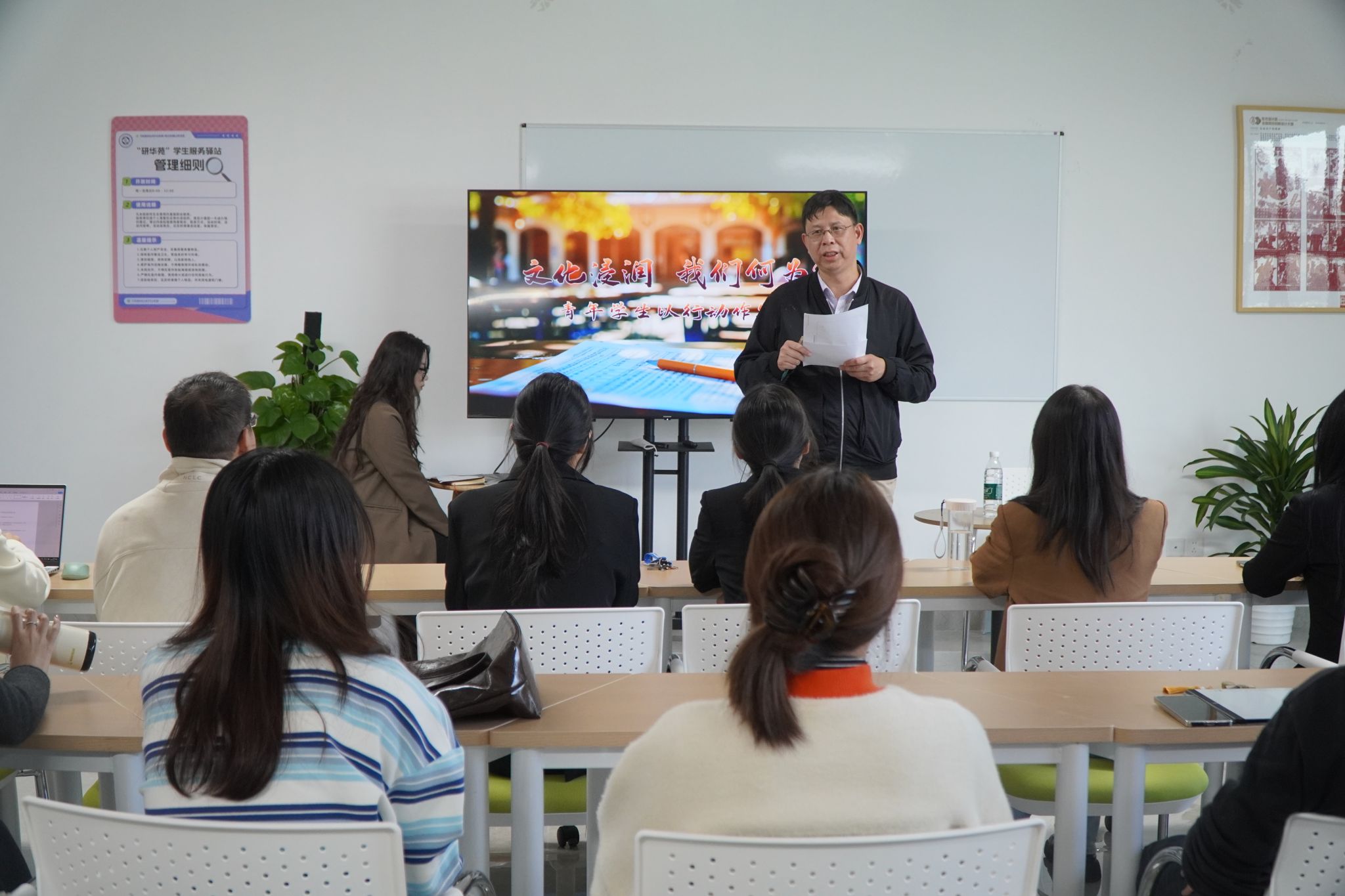 刘园美以《文化浸润 我们何为?——青年学生以行动作答》为题,领学了党的二十届三中全会会议公报和《中共中央关于进一步全面深化改革、推进中国式现代化的决定》精神,梳理了党的十一届三中全会以来历届三中全会制定的重大政策和改革措施,展示了三中全会如何根据当时的社会经济发展状况,逐步推动中国的改革进程。他聚焦“文化”这一高频词、关键词,深入解读了高校文化的精神内核与独特标识,并从“打底色·红色薪火传递者”“护绿意·青春田野守护者”“润心蓝·心灵滋养启迪者”“追金光·卓越典范追随者”等四个维度详细介绍了学院以品牌创建牵引文化建设的具体思路做法。他指出,文化对高校而言,不仅是表面的形式或仪式,而是贯穿于教育全过程的灵魂所在;一所拥有深厚文化底蕴并与时俱进发展的高校,更有可能培育出适应时代需求、具备国际视野且富有创造力的人才。刘园美强调,真正的教育是一个灵魂唤醒另一个灵魂,讲文化不能光讲文化,更要讲学院的历史传承、学术氛围、人文关怀与社会责任。他勉励全体研究生党员要增强文化自信、参与文化传播、创新文化表达,积极参与各类志愿服务与公益活动,创新开展学术研究,理直气壮同不良文化现象作斗争,加强价值观塑造与责任感培育,做新时代文化使命的“践行者”。