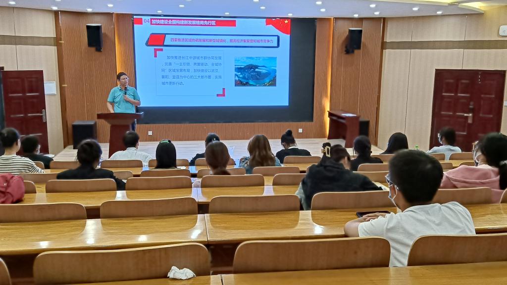 刘园美介绍了省第十二次党代会的召开背景、大会主题,从五个方面具体解读了党代会的报告文本。他简要介绍了过去五年湖北省经济社会发展取得的七大成就,深入分析了新发展阶段湖北面临的新形势新任务,从六个维度、五个方面深刻剖析了新发展理念的内涵特征及今后五年湖北发展提出的工作要求,并围绕省委提出的九大目标举措具体解读了湖北省建设全国构建新发展格局先行区的路径。他基于高校、青年与学校、学生这一现实角色,围绕科教、人才、创新等主题,结合考研就业、创新创业等话题,引导大家思考“经济学子如何在大格局中找准自己的小方位?”这一问题。他勉励大家,要把自己的青春梦想融入湖北省建设全国构建新发展格局先行区大事业中,把聪明才智挥洒在青春奋斗的征程中,不负时代,不负韶华。