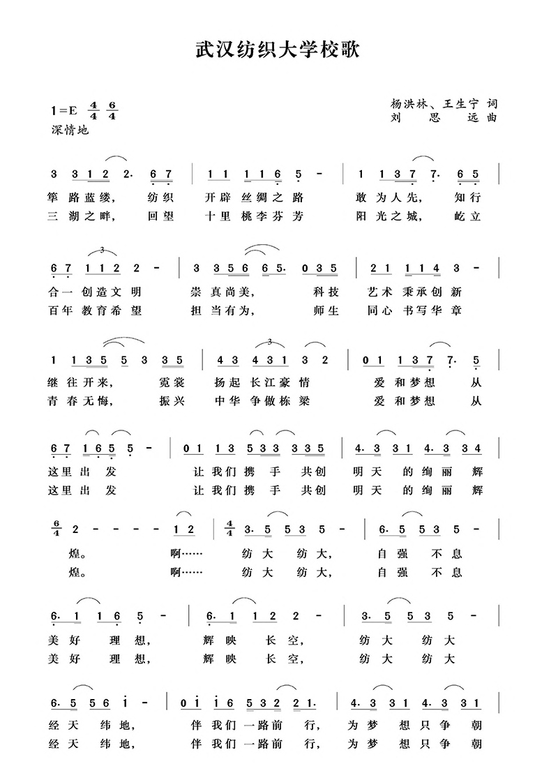 《武汉纺织大学校歌》的词作者、原人文社科学院院长杨洪林还记得拿到完整的谱曲校歌本的那天晚上,对着妻子他忍不住哼唱起来。“特别是唱到副歌的时候,几乎是热泪盈眶了。”杨洪林说,“校歌铸校魂,校歌写出了肺腑之言,唱出了慷慨激昂之声,既有深厚的科学人文底蕴,也有高昂的格调、激越的情感。作为历史悠久、中国唯一以纺织冠名的大学——武汉纺织大学,自强不息是其灵魂风骨,经天纬地是其价值内核,努力培养具有致力于纺织经纬创新,为民族伟大复兴奋斗的经纬之材。”