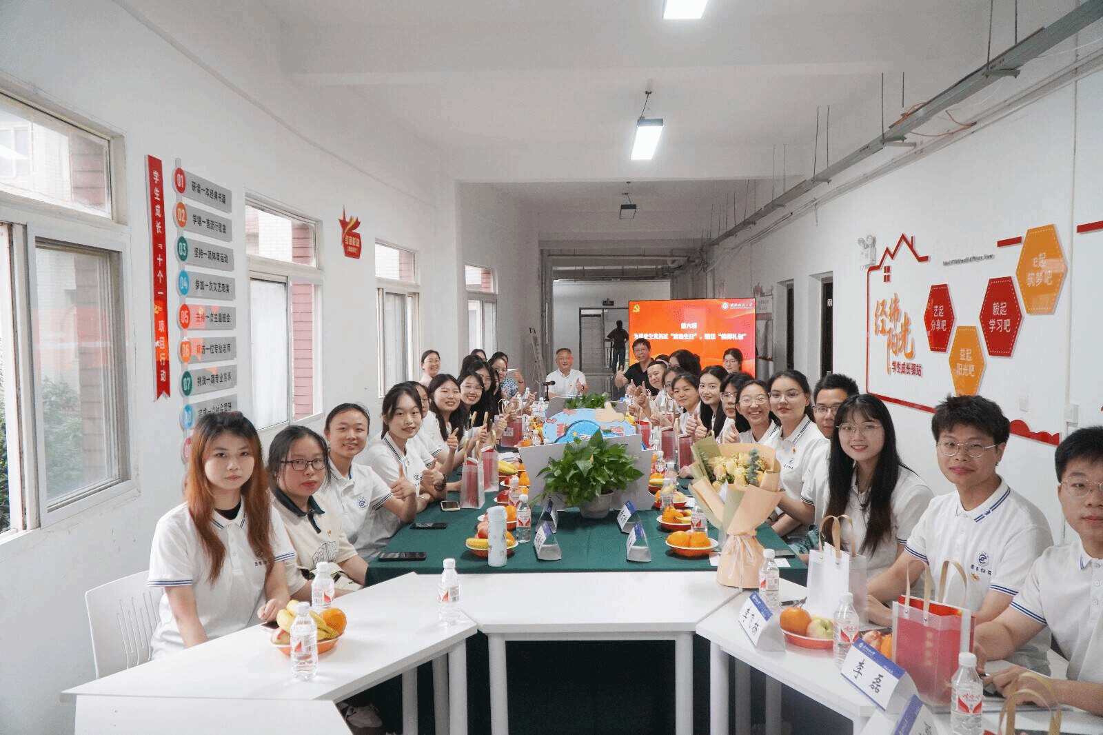 罗锦银为毕业生党员过“政治生日”,赠送包含党徽、温馨提示、政治生日卡以及《中国共产党纪律处分条例》在内的“信仰礼包”,共同切下生日蛋糕。他还与大家一起观看党风廉政警示教育片《持续发力,纵深推进》,书写清廉楹联,传递清廉文化。