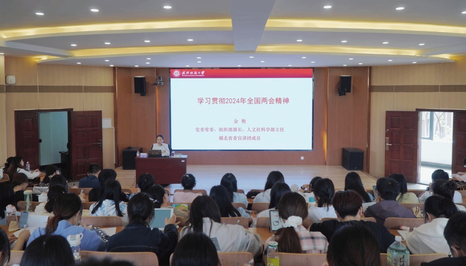 为深入学习两会精神,贯彻新发展理念,4月18日,校党委常委、组织部部长金艳教授在崇德楼T-301报告厅讲授专题党课。经济学院、会计学院党政班子成员以及全体入党积极分子参加本次党课学习。