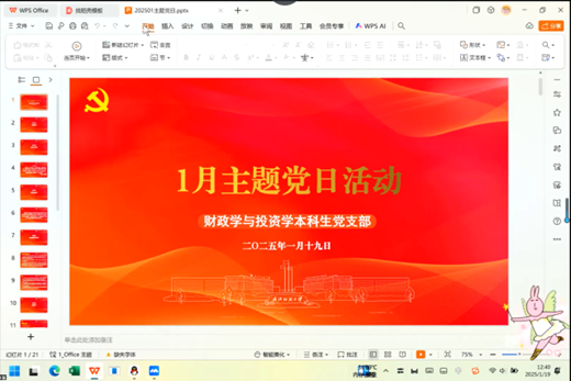 为健全以学铸魂、以学增智、以学正风、以学促干的长效机制,坚持学用结合,深入领会党的二十届三中全会精神,认真学习习近平总书记重要讲话精神,强化学生党员党性修养和党性淬炼,1月19日至27日,学院各党支部于线上组织召开了1月份主题党日活动。经济学院教工党支部、学生党支部全体党员参加会议,各党支部书记主持会议。